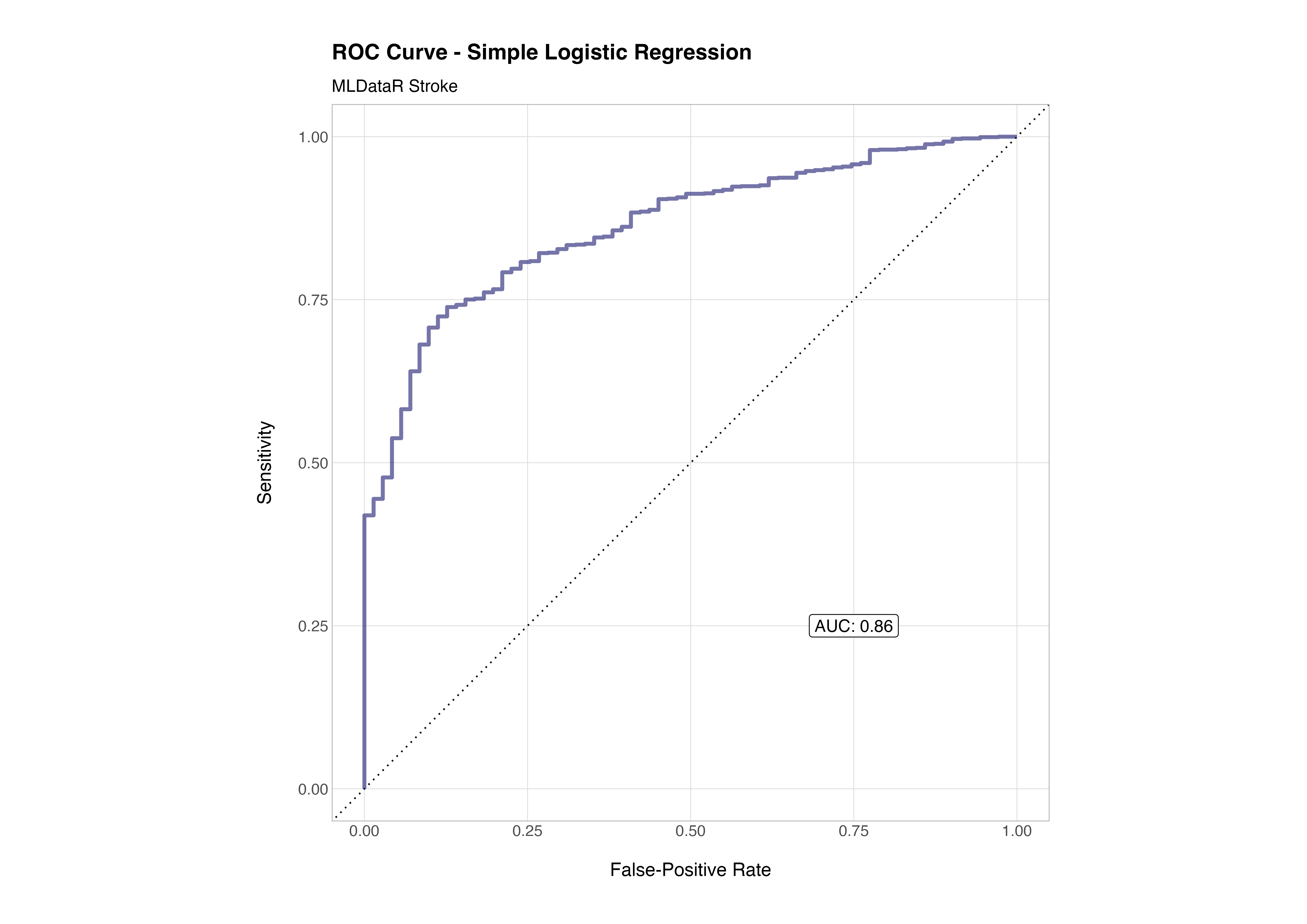 In this case, the AUC of 0.86 indicates that the model has good discriminative ability - it can correctly distinguish between stroke and non-stroke cases about 86% of the time. That’s a strong performance given the simplicity of the model, minimal feature engineering, and relatively modest preprocessing. It reflects both the informative nature of the underlying features (age, glucose level, hypertension, etc.) and the suitability of logistic regression as a first baseline model for this kind of structured clinical data.