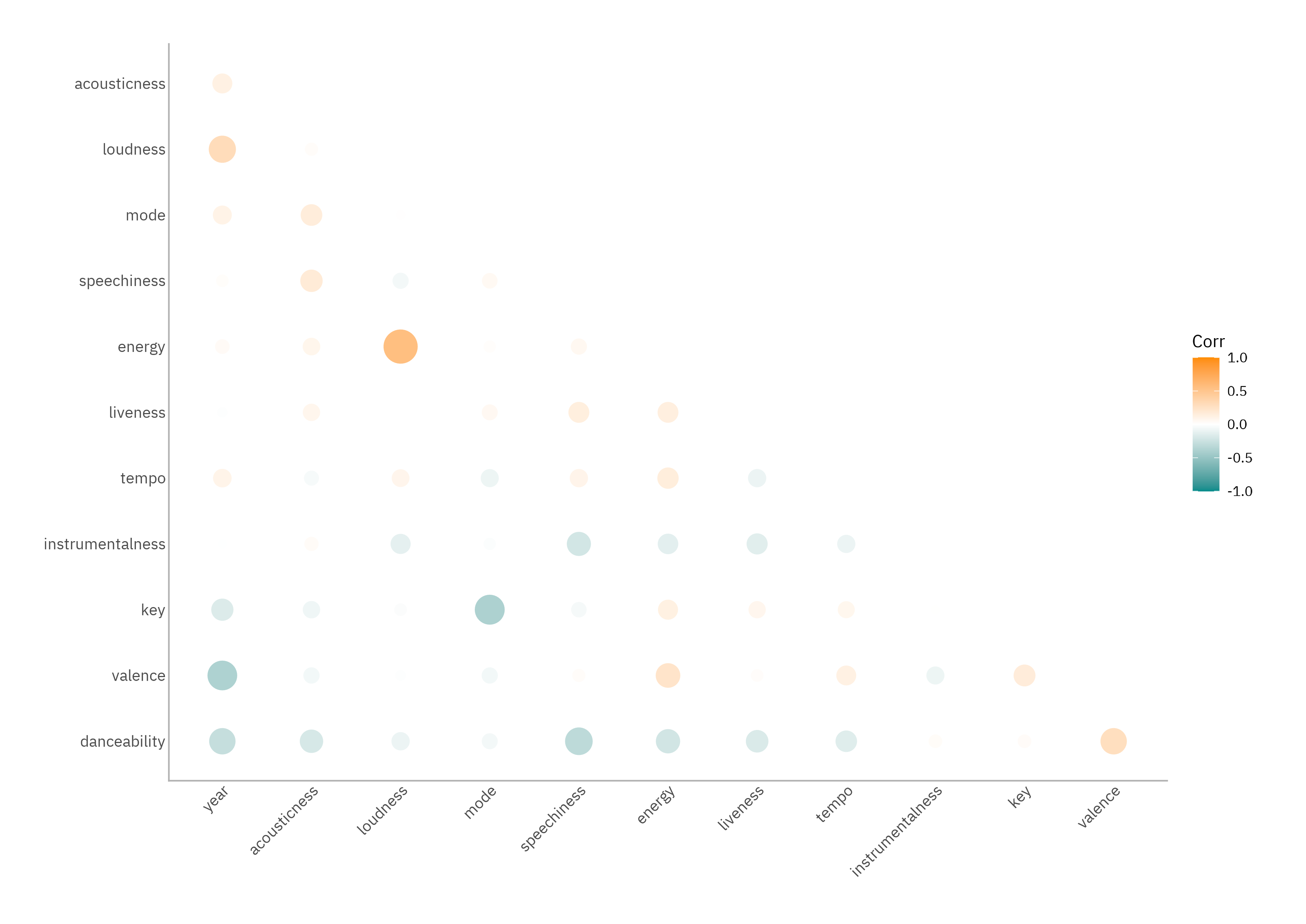 The absolute magnitudes here aren’t enormous (these aren’t omics data) but there are patterns worth keeping: newer tracks tend to be louder, less upbeat, and less danceable. Older ones lean more towards groove and positivity. This shouldn’t shock anybody who’s ever compared The Breaks (Kurtis Blow, 1980) to something released more recently. Energy, loudness, and valence also hang together: hype tracks are louder, more energetic, and generally more positive. Meanwhile, tracks heavy on speechiness tend to be less instrumental and less danceable. Makes sense.