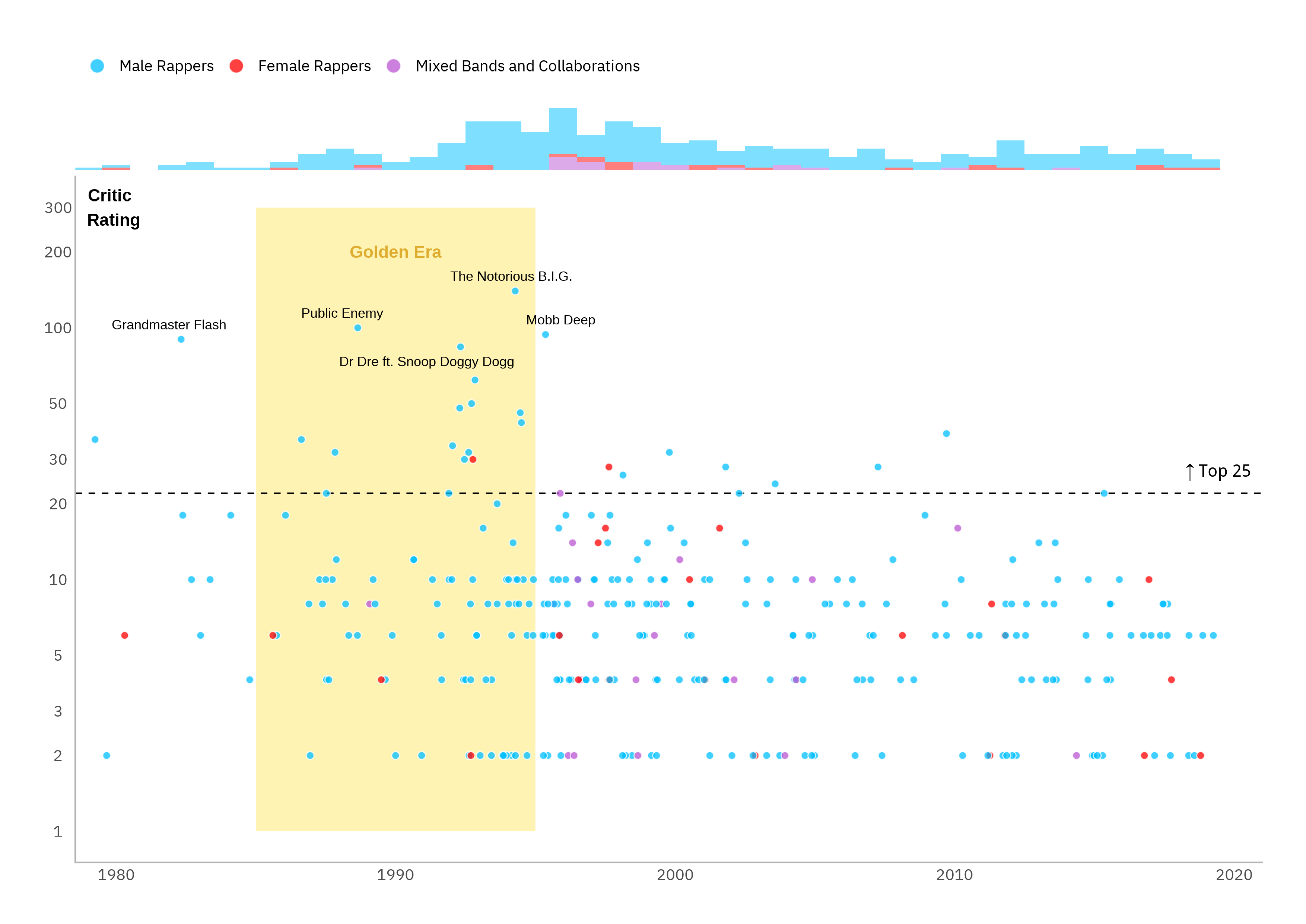 In his original Datawrapper article “The best hip-hop songs of all time, visualized”, Simon Jockers did a lot of the fundamental EDA legwork for us. I thought it would be nice to just rebuild his flagship plot with a few light embellishments to aid interpretability.