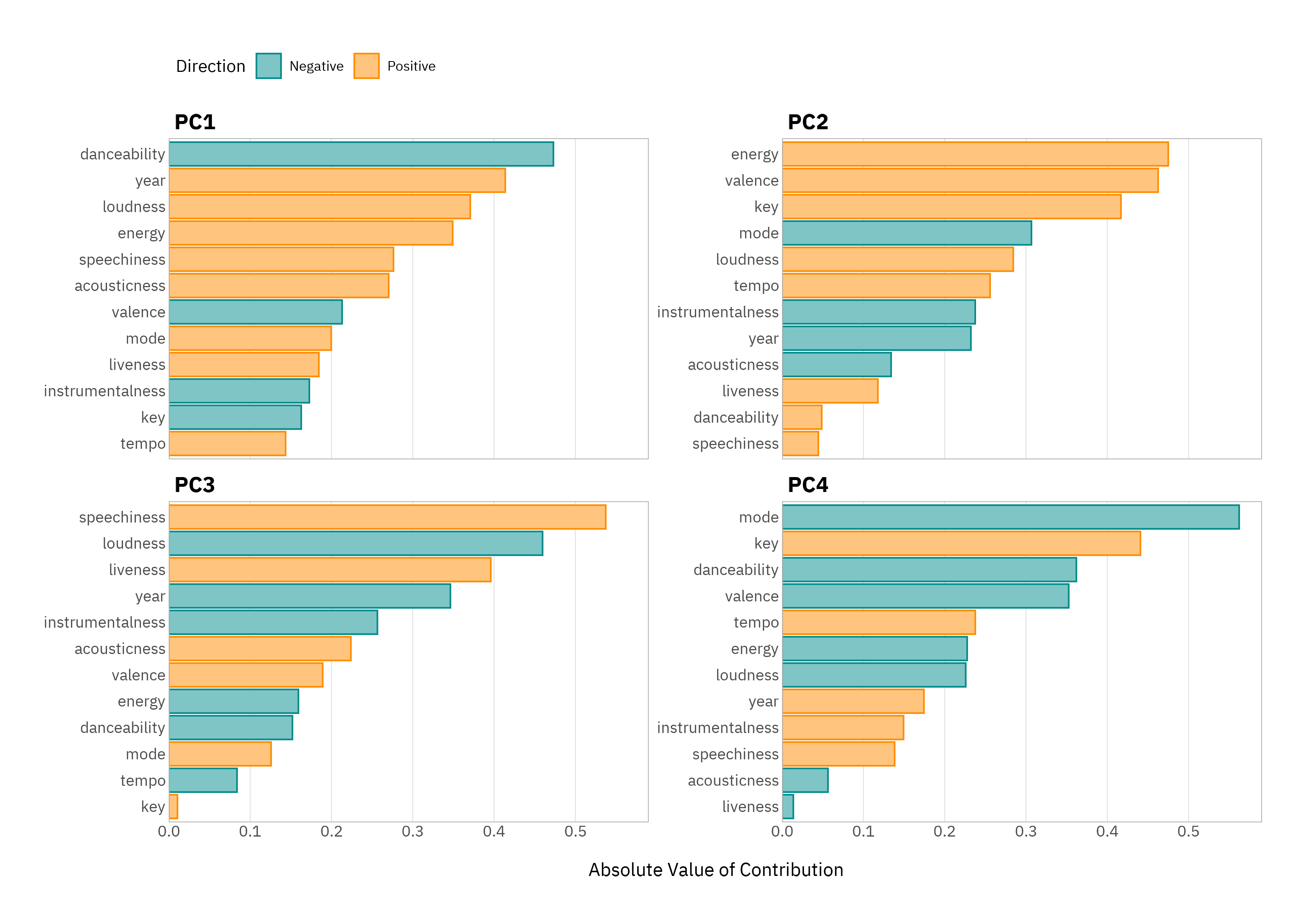 A few patterns jump out. PC1 is mostly about the danceability versus track release year; older tracks are more danceable. PC2 is the “good vibes versus gloom” axis - it’s mostly energy and valence. PC3 is mostly speechiness versus loudness - think spoken-word-heavy, less “produced” tracks versus more instrumented, polished ones. Finally, PC4 is about the musicality - key, mode, harmonic characteristics.