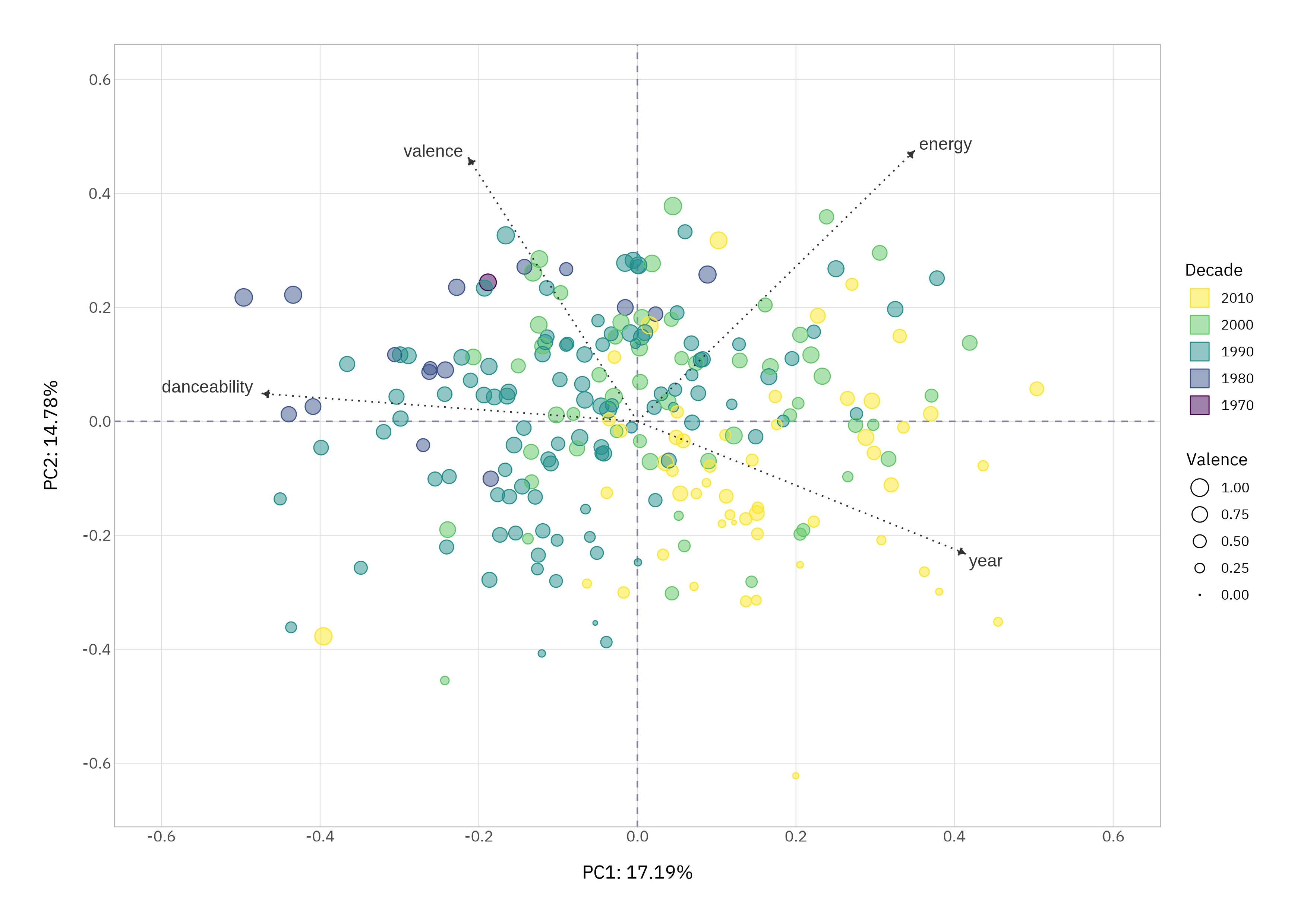 Plotting tracks using their coordinates along the first two components gives us an intuitive landscape to understand these patterns further.