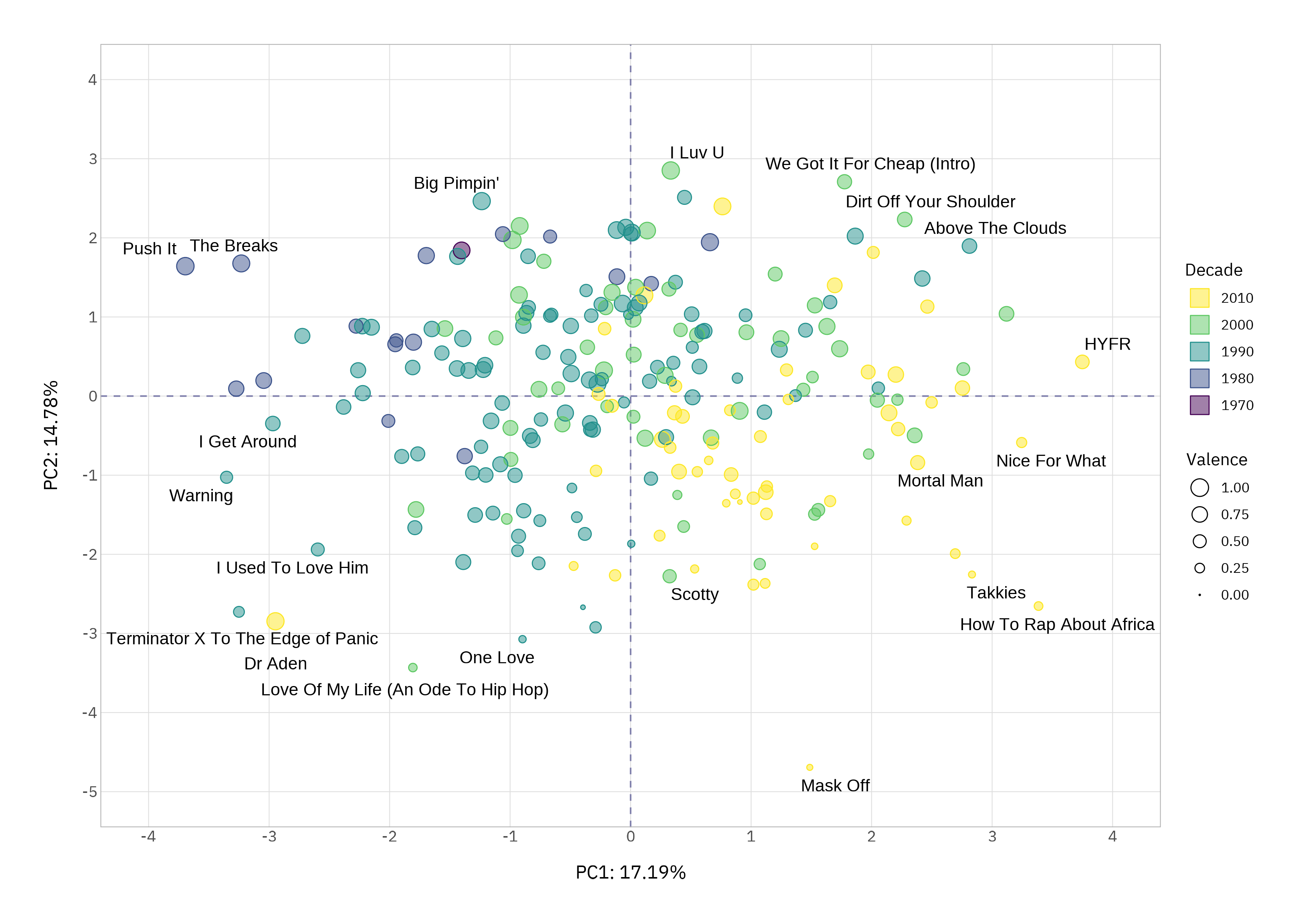 We can sanity-check this using the corners and by listening. In the top-left we should have old, danceable and high valence songs. Yes! The Breaks (1980) and Push It (1986) are definitely in this class. Bottom-right should be newer, less danceable, low energy and low valence songs. How to Rap About Africa (2016) and Mask Off (2017) confirm the data behaves.