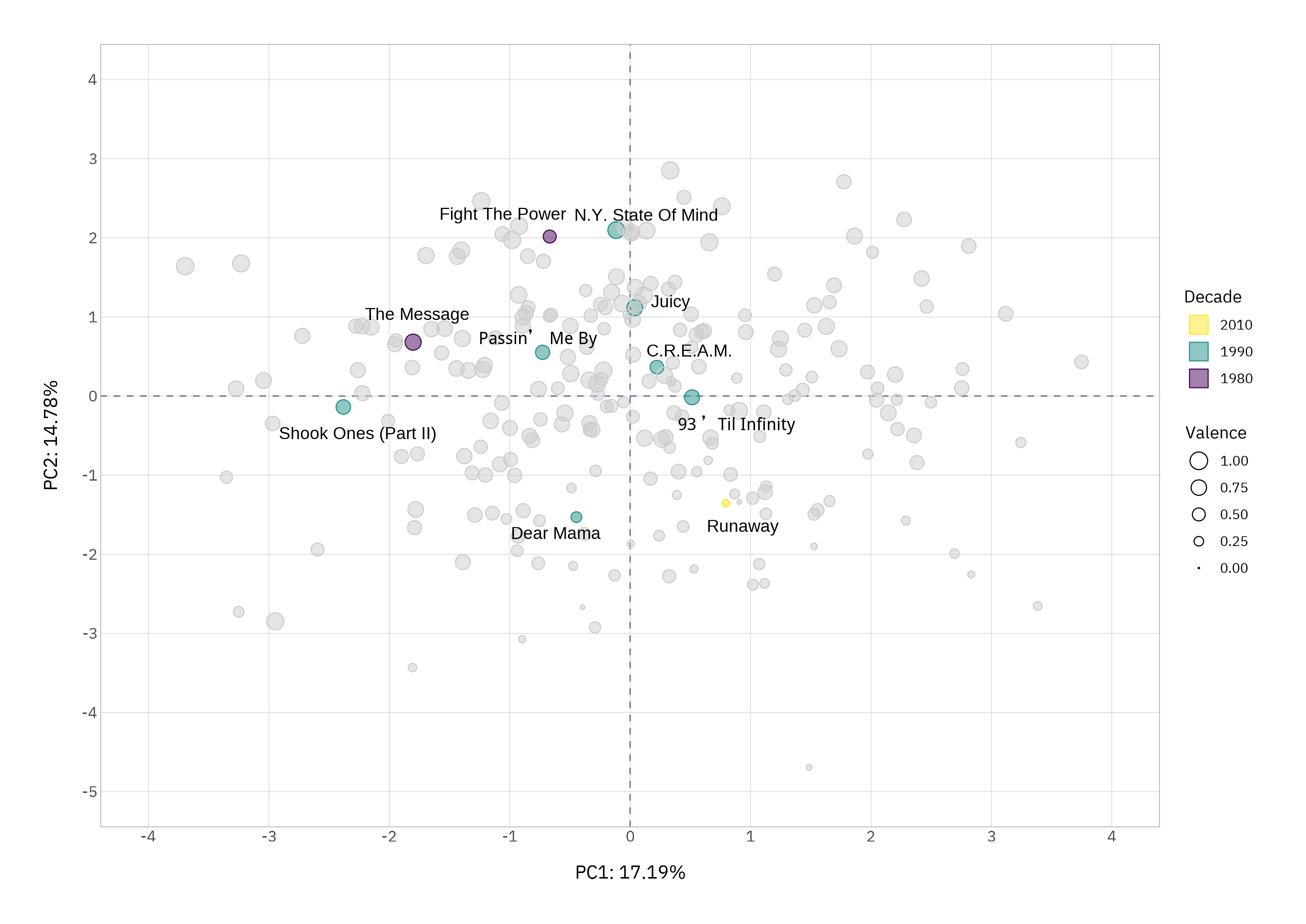 What PCA reveals here isn’t a new ranking or prescriptive formula for what makes a classic hip-hop track - it simply makes the structure of the genre visible: how groove, energy, positivity, and era intertwine.