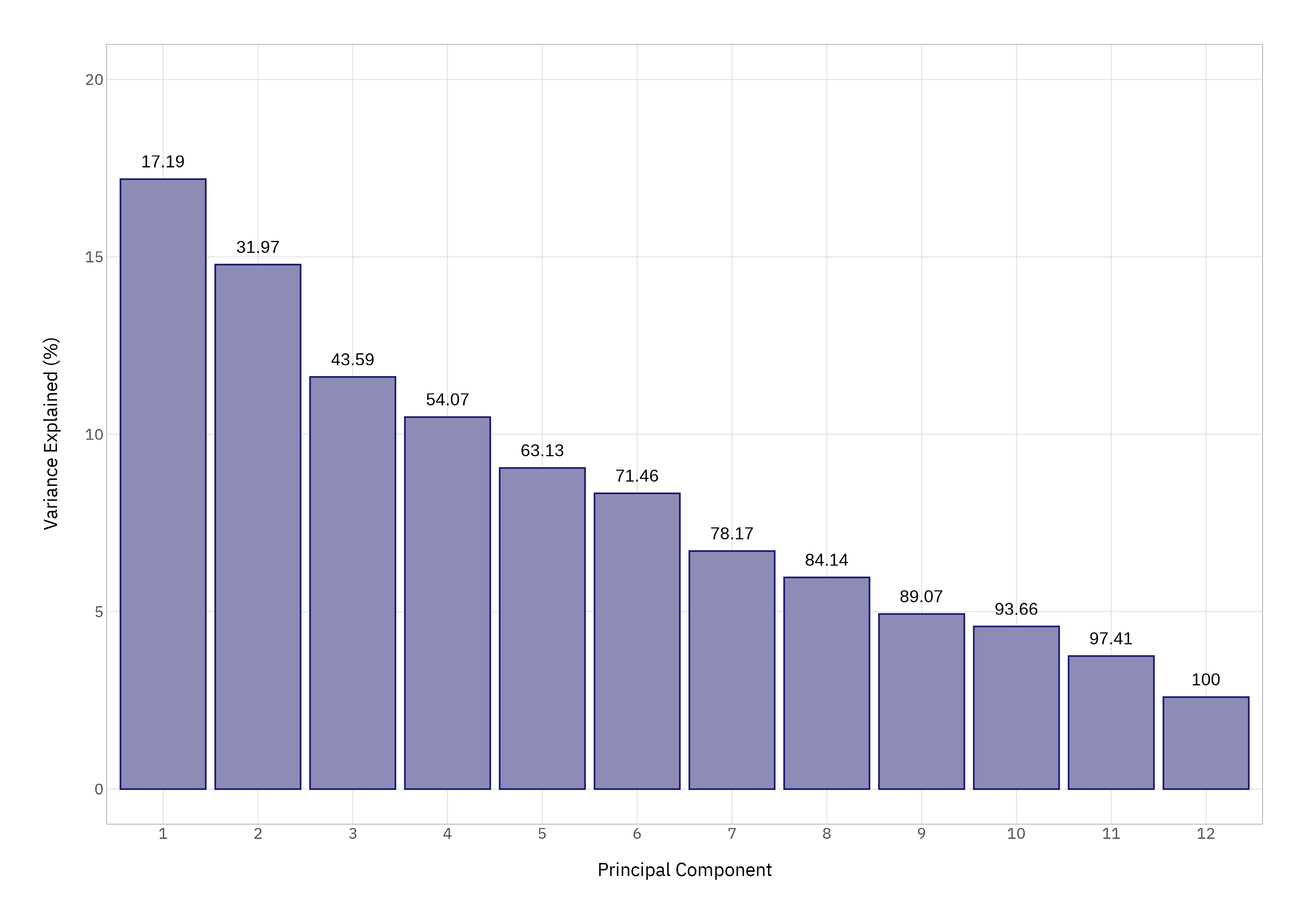 A quick scree plot - because we can make a quick scree plot - confirms that the first four components capture just over half the variance.
